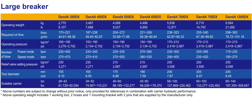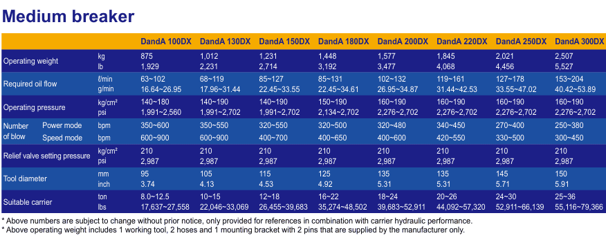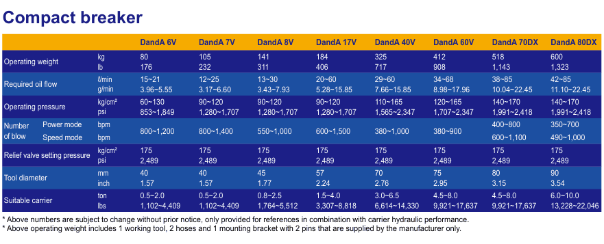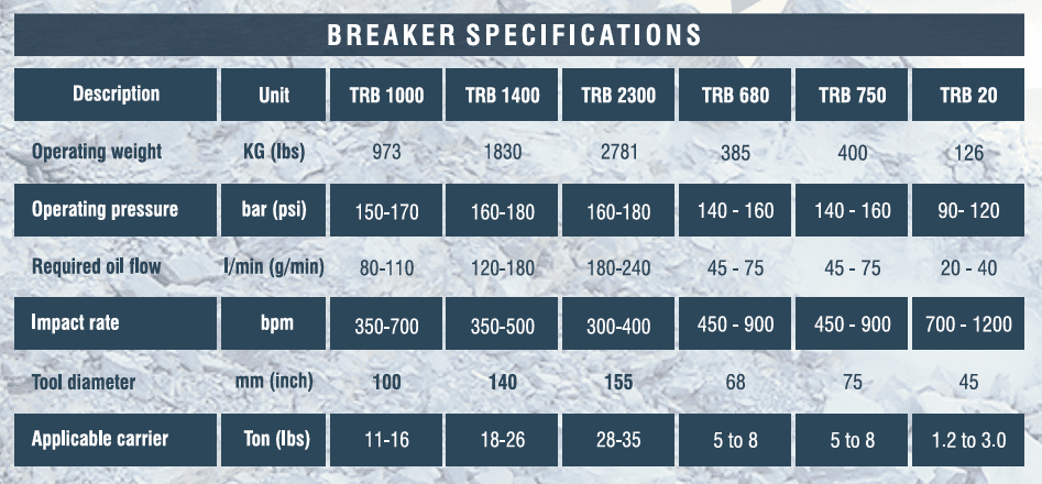 ♦ 23 breaker models that cover the entire CE industry carrier range from 0.5 to 140 ton